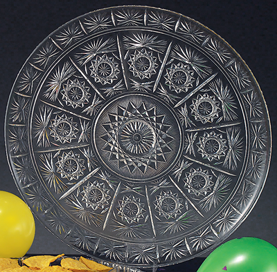 Plastic large round tray 16.5” The simulated crystal cut design gives this plastic tray a look of elegance. Line with greens and load with your favorite cuts of sandwich meats .